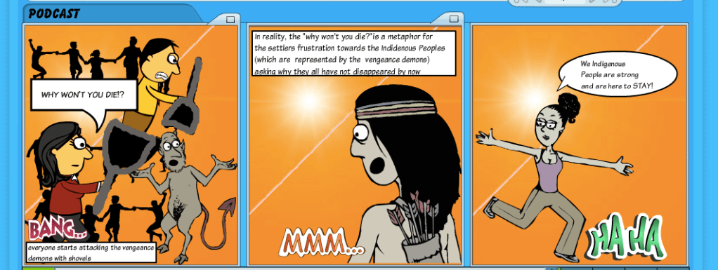 This is the comic I created using ToonDoo in response to the Buffy Podcast viewed in class. The quote “Why won’t you die” is in reference to the many settlers who tried exterminating the Indigenous peoples.
